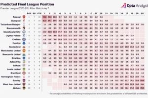 超算预测本赛季英超冠军:阿森纳44.0%,利物浦31.3%,曼联为0%